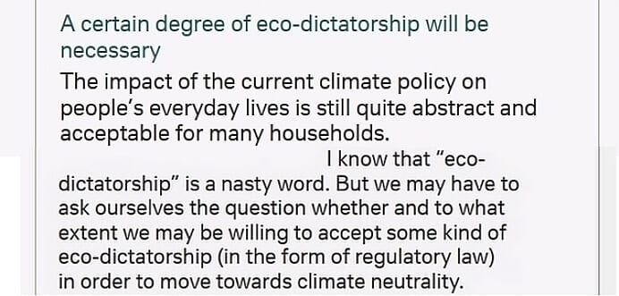 The DB analyst denounces EU sales pitches touting the Green Deal as "a new growth strategy" that will enable the EU to become a "fair and prosperous society". But in fact it will be necessary to overhaul the entire European economy, plus the political and legal system, and that will only succeed with "a certain amount of eco-dictatorship", according to Heyman, because without it the people will manage. eco-harassment just won't take. The analyst warns of “massive political resistance” as soon as people realize where it is going.