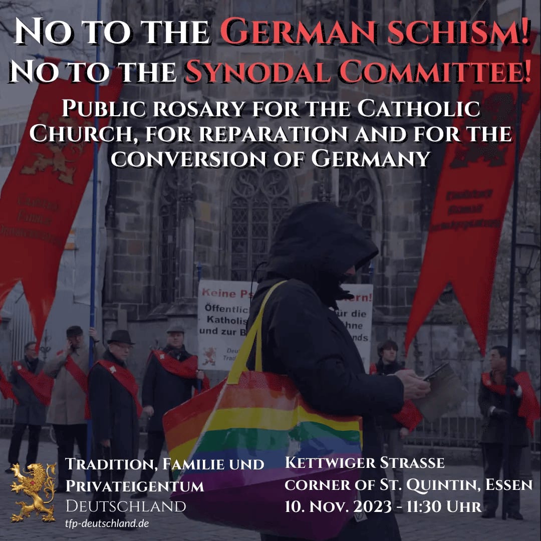 In protest and representing the majority of the faithful who oppose this, we will be in front of the Essen Cathedral to pray a public rosary of reparation and to distribute a manifesto warning the faithful and calling them to resist.