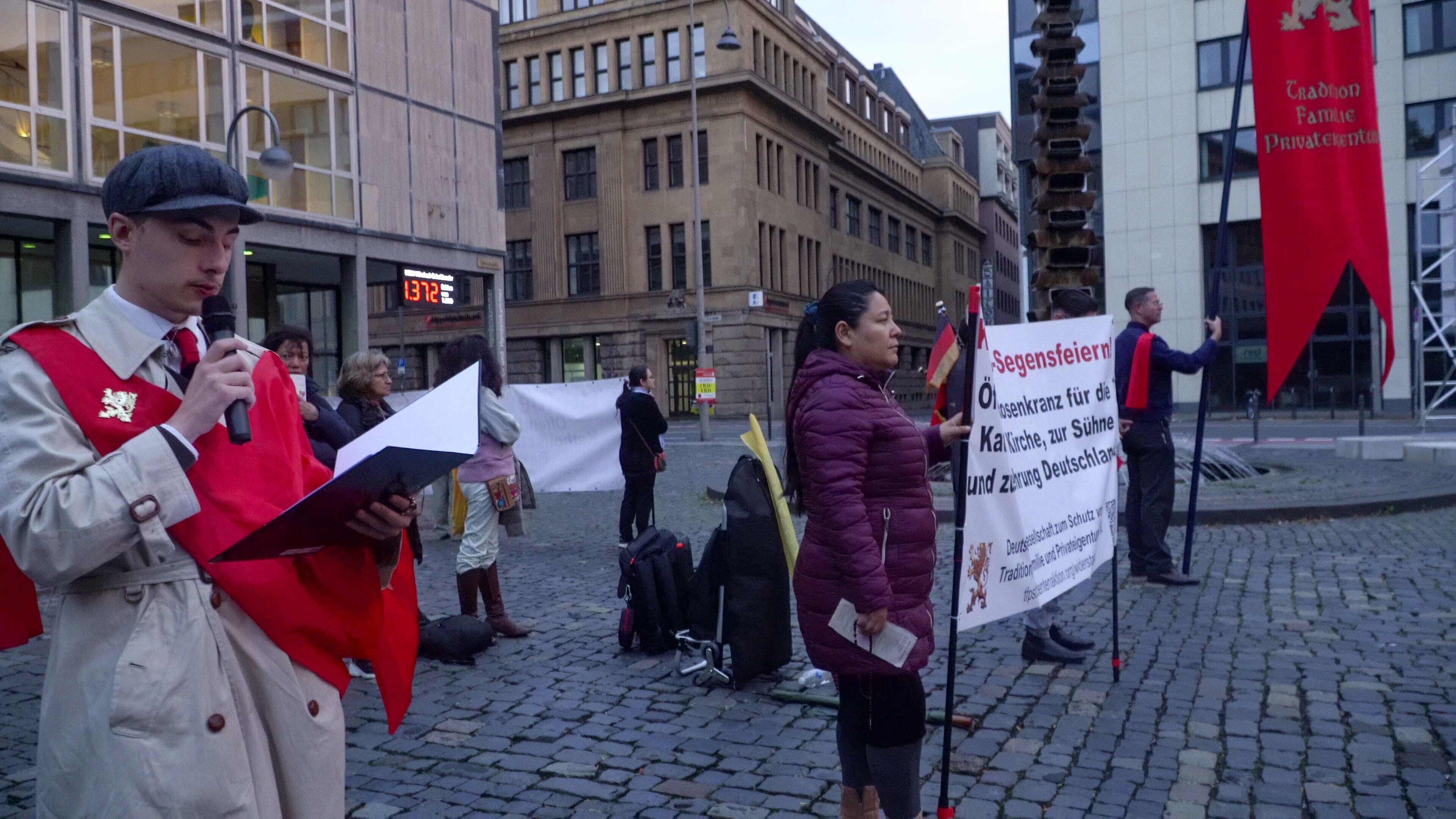 The "ceremony" was broadcast on the channel of the ‘Kölner Jugendchor St. Stephan’ (Cologne Youth Choir), however, the images revealed a reality quite different from what the name suggested: The participants, completely isolated even from their own militancy, appeared to have an average age of around 50.