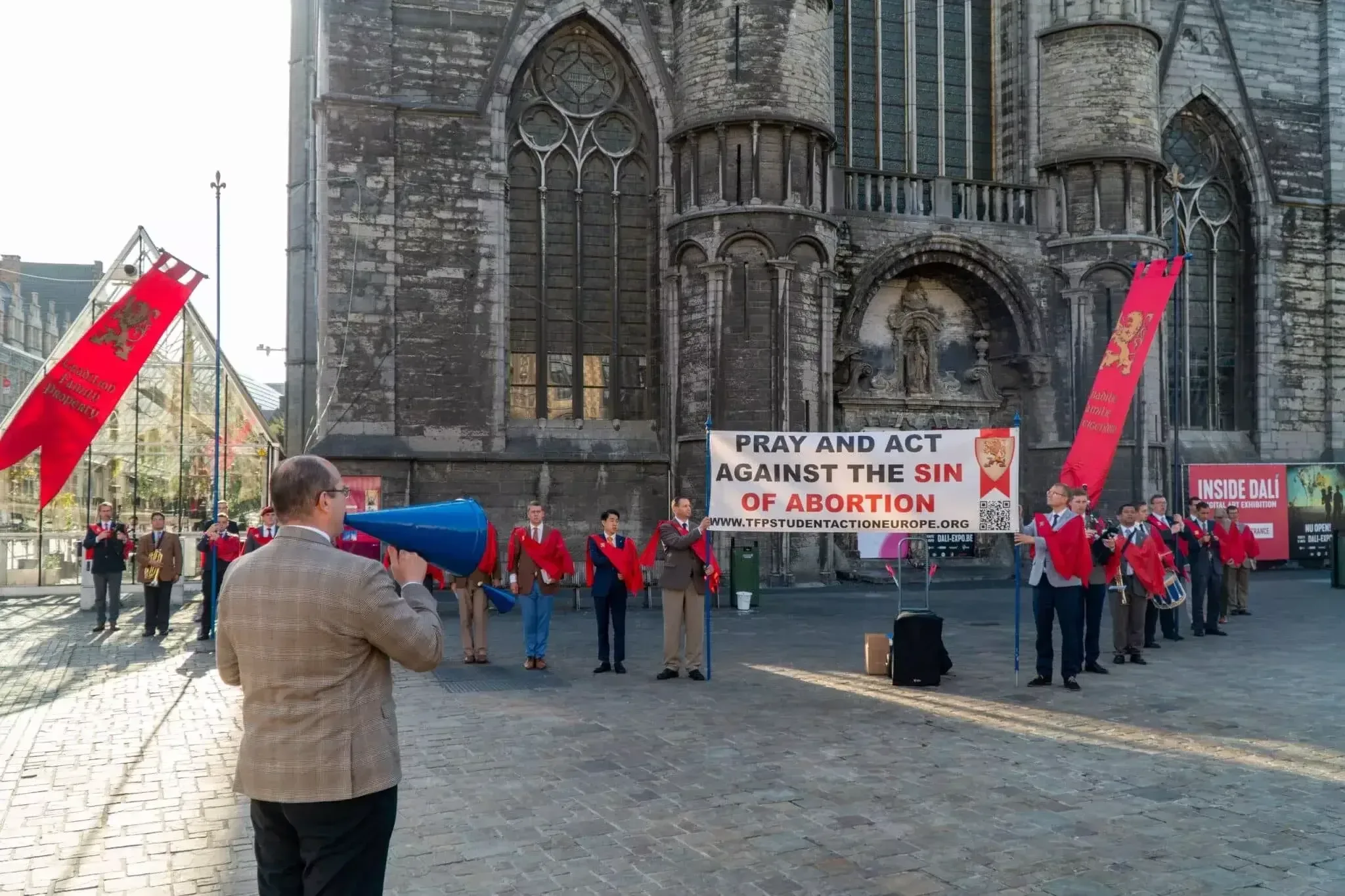 The following morning, August 20, the young men of TFP Student Action Europe campaigned in the Belgian city of Ghent. The campaign started in the medieval Korenmarkt, where many people accepted leaflets. Gradually, pro-abortion leftists gathered, hurled insults or screamed profanities.